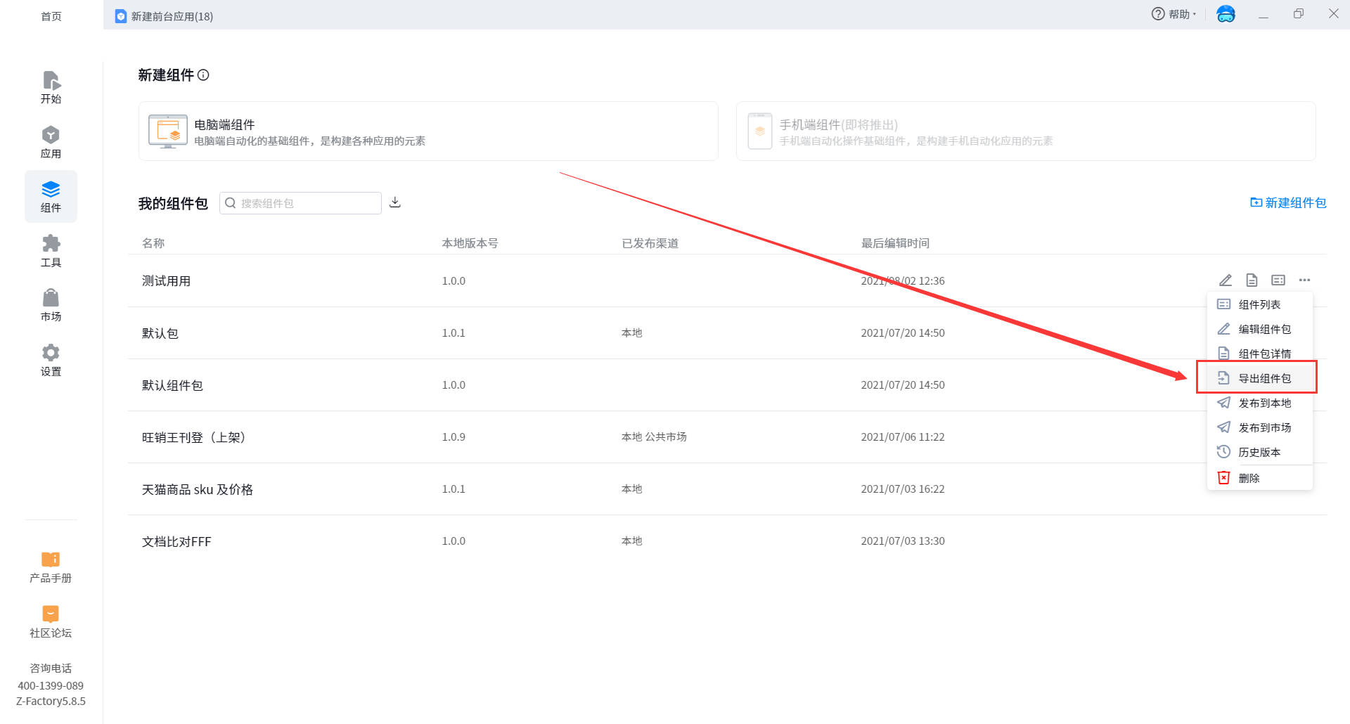 1. Home page - components, select a component package to export, and click more to see the export component package options, as shown in the following figure.