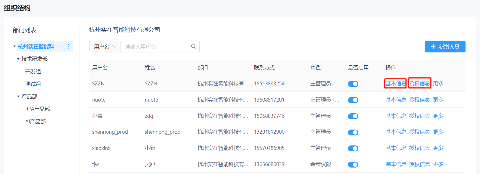 找到需修改的人员,支持使用用户名、姓名、手机号进行搜索,可进行人员的基本信息和授权信息的修改。