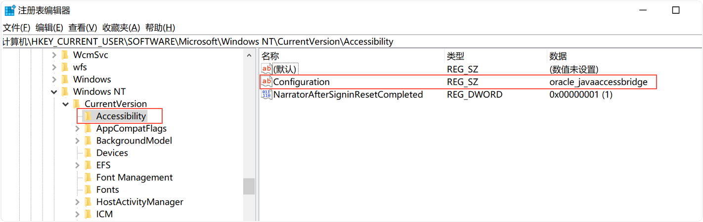 ② Determine the write location. Enter the path "computer \ hkey_current_user \ software \ Microsoft \ Windows NT \ CurrentVersion \ accessibility", click "accessibility" to find "configuration", and modify the value to "oracle_javaaccessbridge".