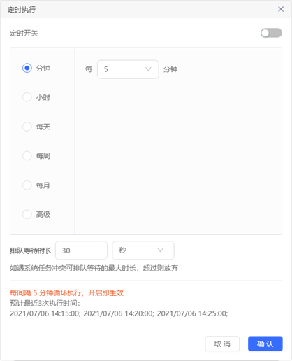 Click the more icon on the right side of a task, select the set timing option, and the timing setting will appear. Set timing rules according to business conditions. The system supports setting by minute, hour, day, week and month. For users who know more about the corn expression, you can choose to use the advanced mode and enter the corn expression to set timing.