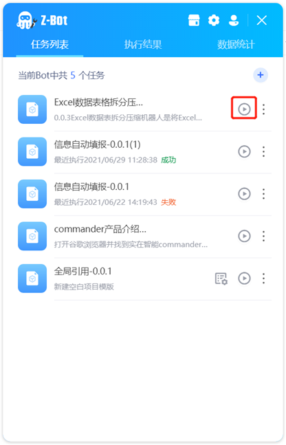 For unexecuted tasks, click the icon shown in the red box to run the task. After clicking, the task is in running status. Click again to stop the task.