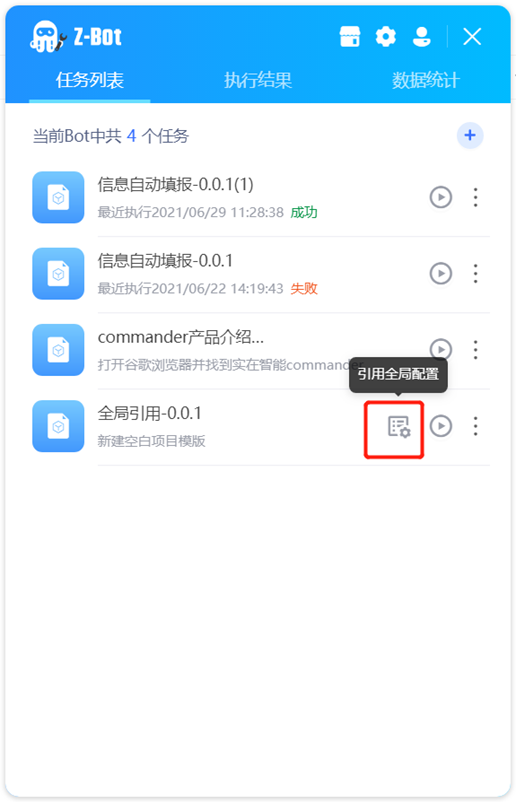 For processes with global reference set, you can set global reference parameters before task execution, and click the icon in the red box to enter the reference setting page. If the process does not have a global reference set, the icon will not appear.