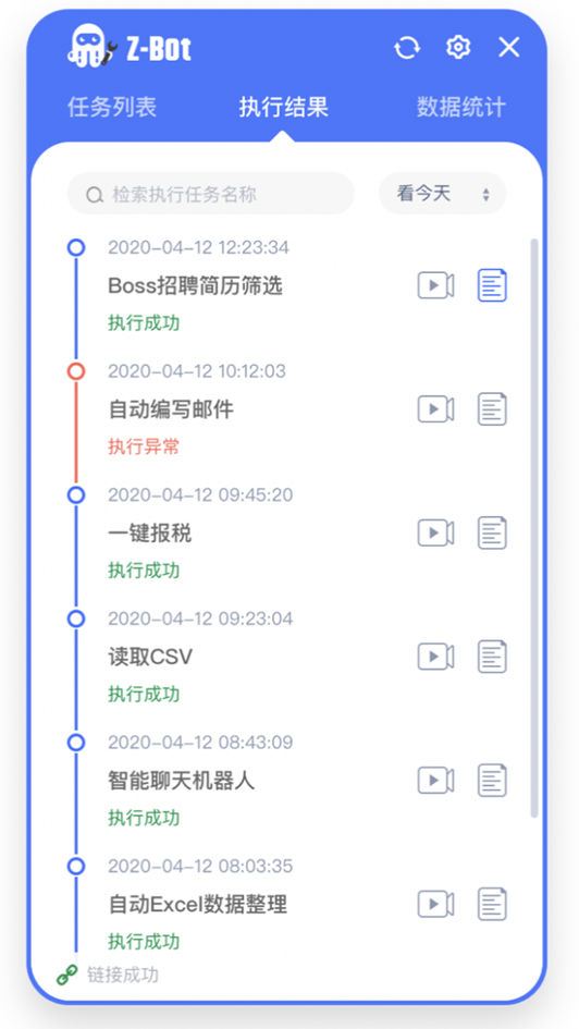 The execution result shows the records and results of all tasks on the z-bot terminal robot in the form of time axis, which can quickly understand the execution of tasks at each time point and understand the operation of the z-bot terminal robot. By default, all the execution recording processes of the machine are displayed, which can be filtered by task name or time.