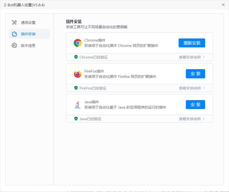 The z-bot terminal robot provides an execution engine for application processes, but for some process applications that need to be executed under the browser or supported by Java plug-ins in special scenarios, corresponding plug-in support is required. In the z-bot terminal robot, the plug-in can be set. The current system plug-ins include chrome plug-ins, Java plug-ins and Firefox plug-ins.