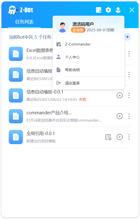 The avatar at the top corner currently has the functions of entering commander, entering personal center, viewing help documents and exiting login.