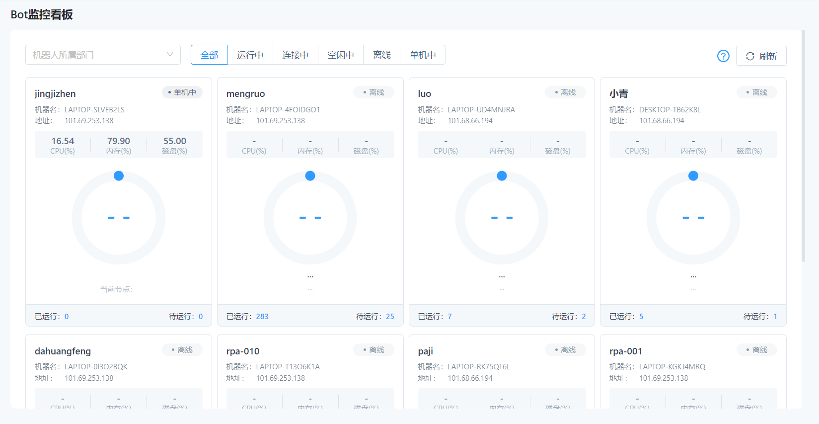 Get all BOT information in real time, including BOT login account and IP; Utilization of CPU, memory and hard disk resources of the equipment; Display the node and execution progress of the task being executed; History of performed records and subsequent tasks to be run.