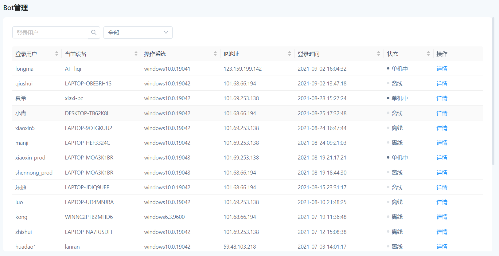 Enterprise RPA often connects multiple BOT robots. BOT management allows users to intuitively understand the login status and use status information of robot resources. It also supports fast positioning through search and filtering. The BOT account assigned through the commander intelligent hub will appear in the BOT management list.