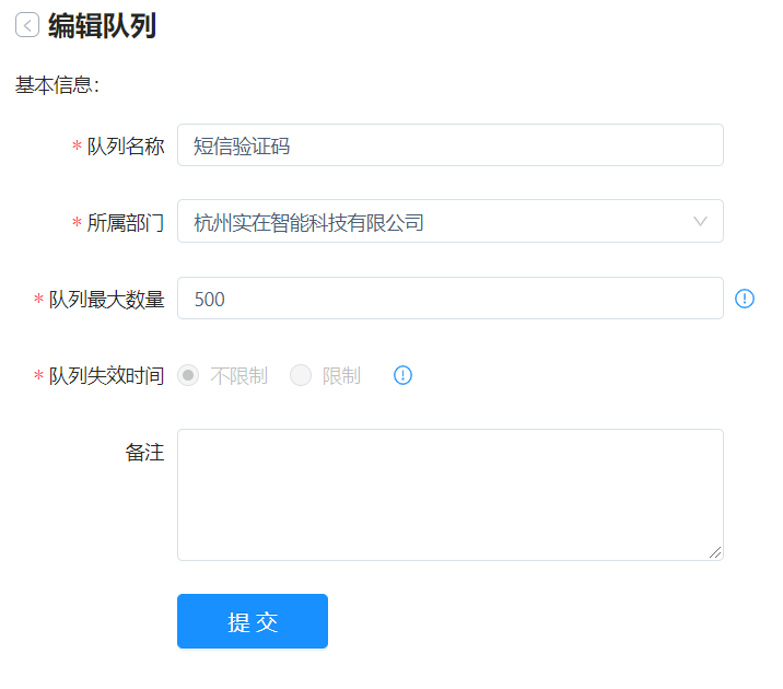 When editing a queue, the queue expiration time type cannot be modified, that is, if the original setting is not to limit the expiration time, it cannot be modified to need to limit the expiration time. When the expiration time is set, it cannot be modified to not limit the expiration time, but the specific expiration time can be modified.