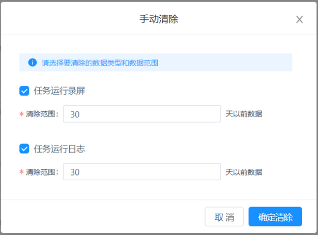 Since the task running screen and log will occupy a large storage space when stored in the commander, if they occupy too much, it may affect the processing speed of the server. It is recommended to set relevant cleaning rules. After automatic cleaning is enabled, the system will automatically clear the corresponding data.