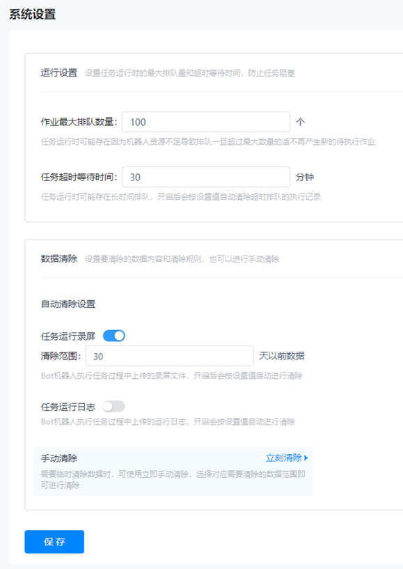 System settings support operation related parameter settings and regular clearing rule settings. Among them, the running settings include the maximum number of jobs queued and the task timeout waiting time. After modification, it will work on the newly created task, and the modification will not affect the already created task.