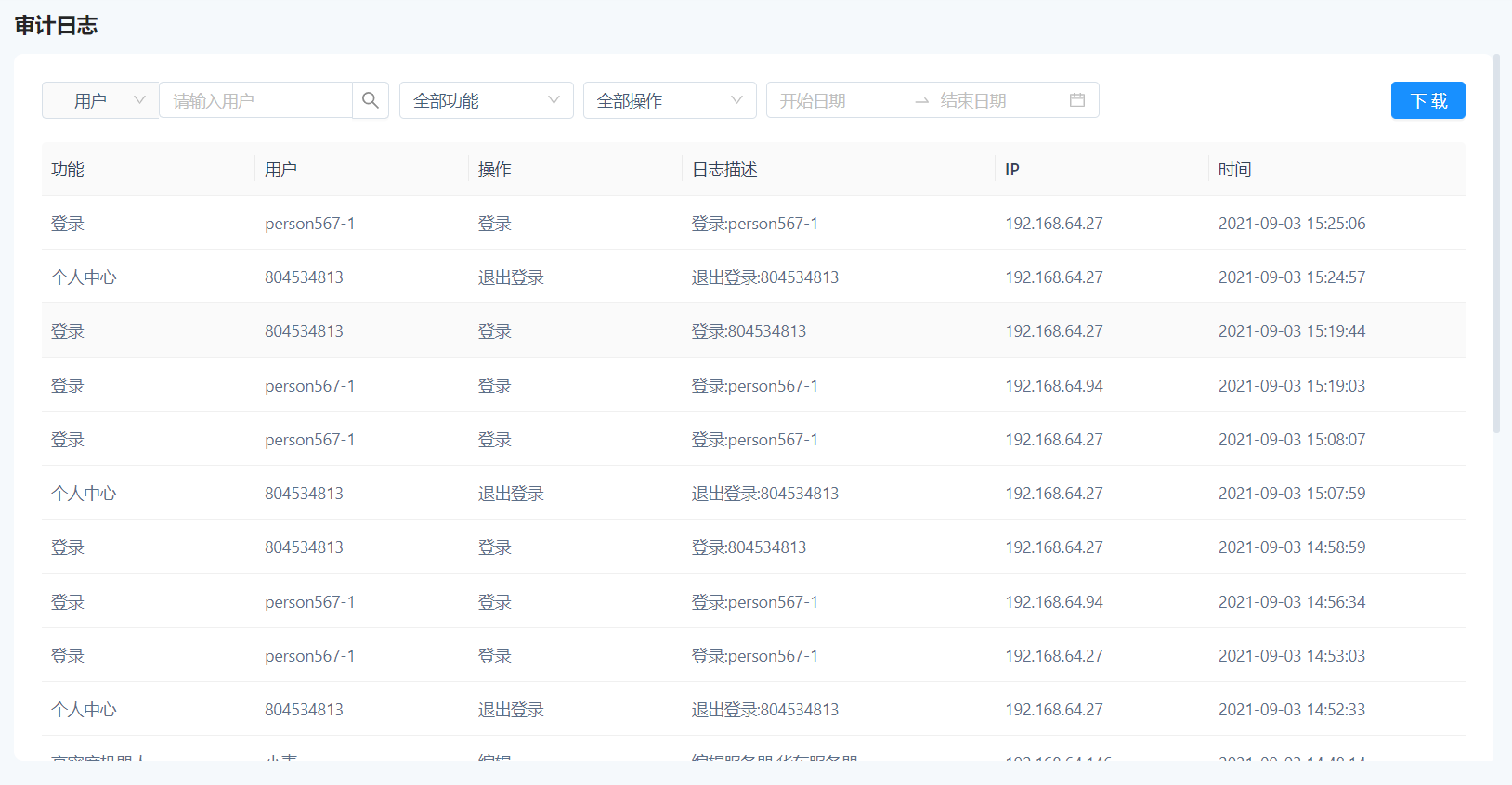 The audit log shows the user, function, operation, detailed description, IP and occurrence time. It also supports multi condition query, and supports downloading Excel files for local saving.