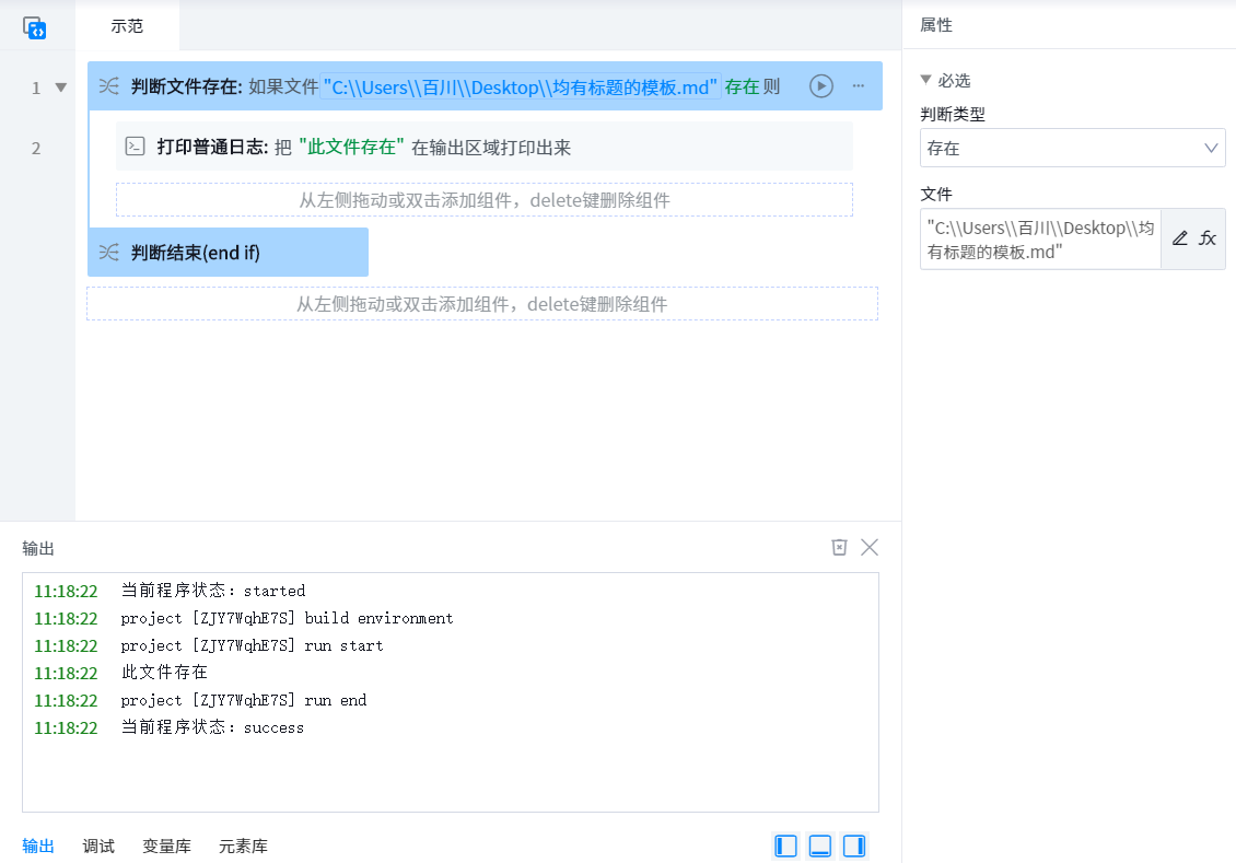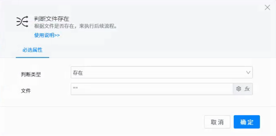 ●Judgment type: to judge the status of the target file, select & ldquo; & rdquo; Or & ldquo; & rdquo; does not exist;.
