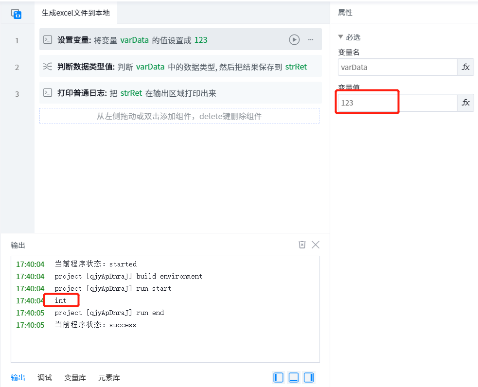 First define the variable vardata and assign 123 (number), then save the variable return value to the variable strret by judging the data type value component, and finally print the type of strret:
