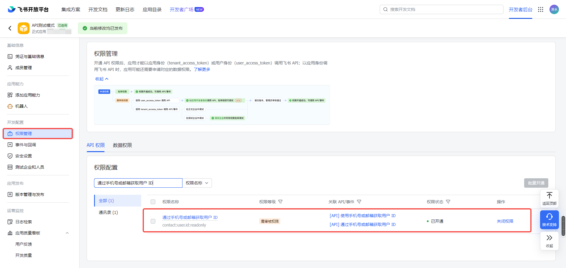 b、开通【通过手机号或邮箱获取用户 ID】、【获取用户 User ID】权限