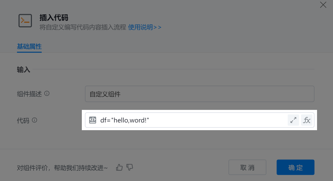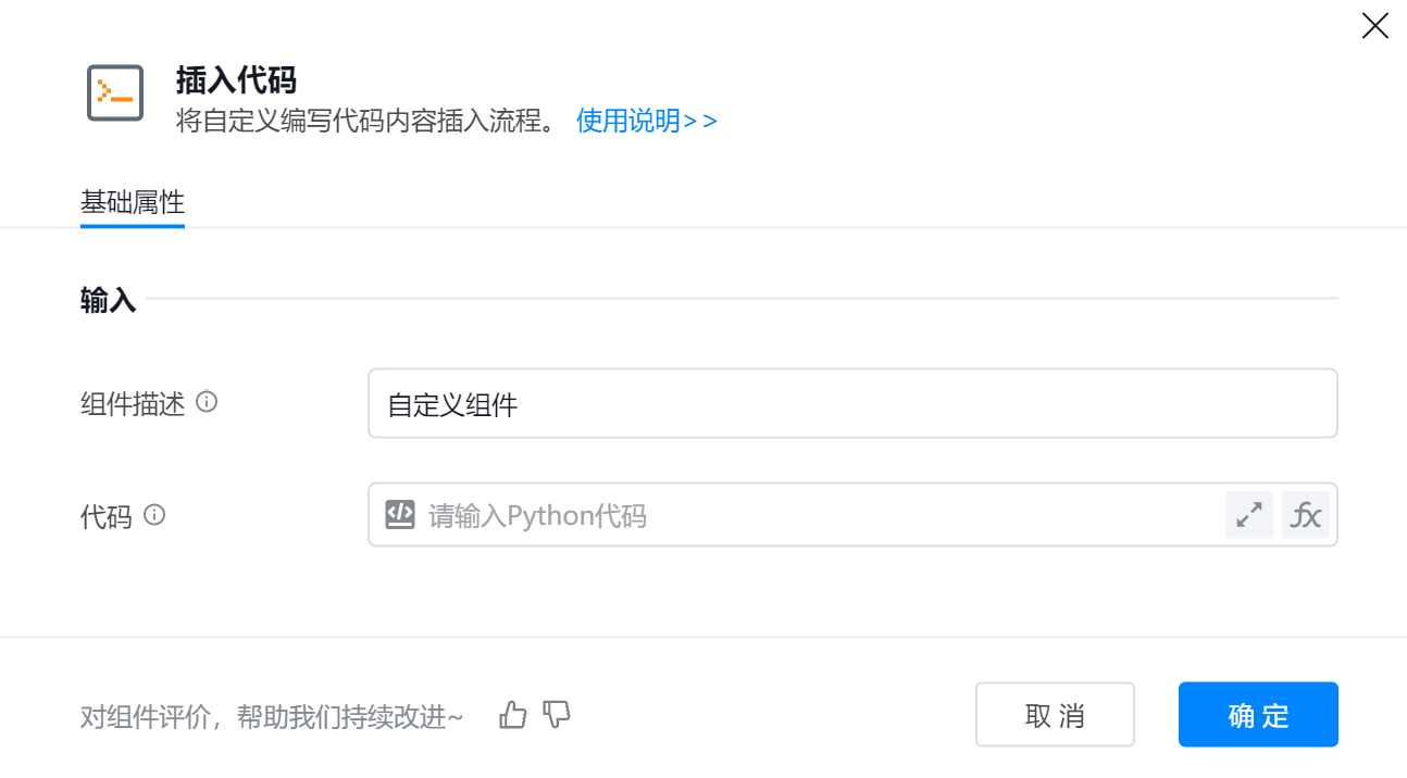 ● 组件描述:用户对该自定义代码的描述,描述将在可视化界面显示,对组件功能不会造成任何影响,仅方便用户了解此代码的用途。