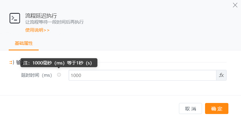 延时时间:让流程等待的具体时间,以毫秒为单位,可以直接输入,也支持从变量库选择。