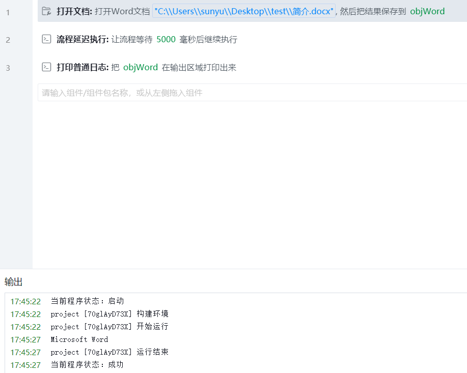 使用该组件,设置延时5秒。然后运行组件打开指定文档,等待5秒,指定文档被打开。