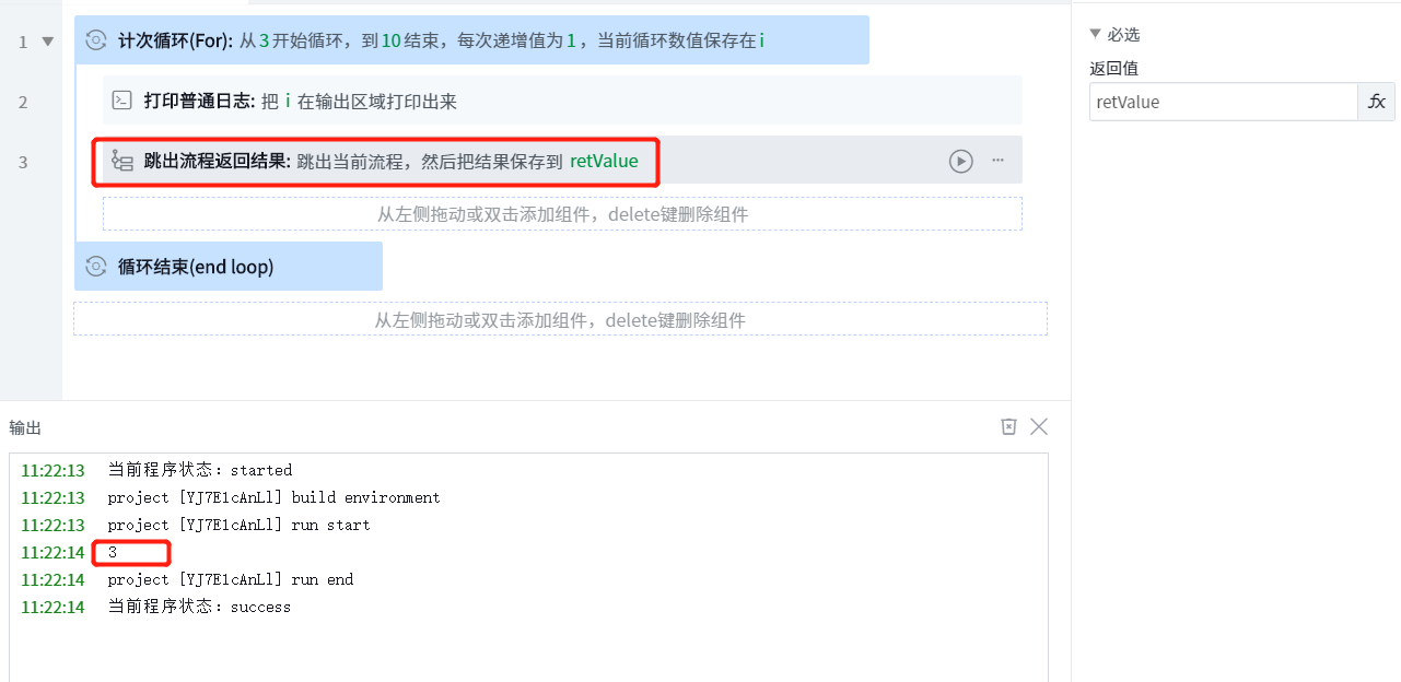 The for loop itself starts from 3 and needs to be executed to 10. However, due to the use of the jump out process return result component, the number after 3 will not be executed again;