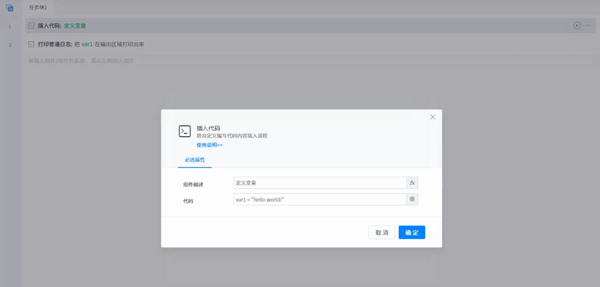 ● Component description: description of the user-defined code filled in by the user. The description will be displayed in the visual interface to facilitate the user to understand the purpose of the code.