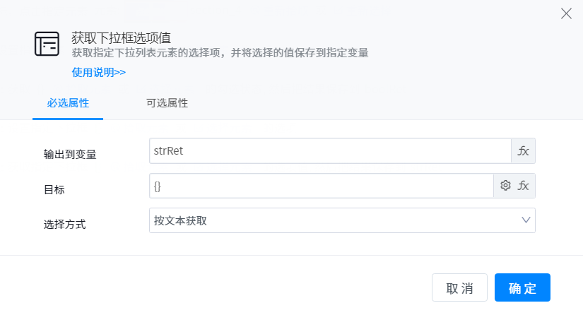 Gets the selection of the specified drop-down list element and saves the selected value to the specified variable.