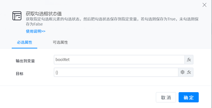 Get the check status of the specified check box element, and then save the check status to the specified variable. If it is checked, it will be saved as true, and if it is not checked, it will be saved as false.