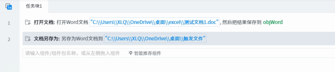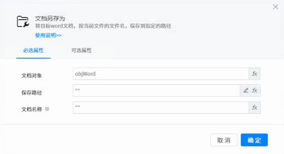 ● Document object: represents the word document object to be operated on. You can use the variables returned by components such as open document.