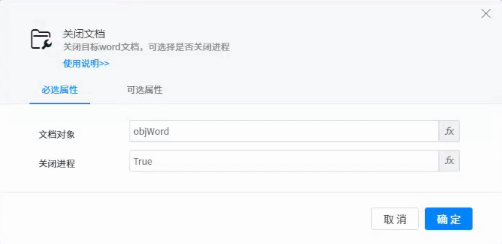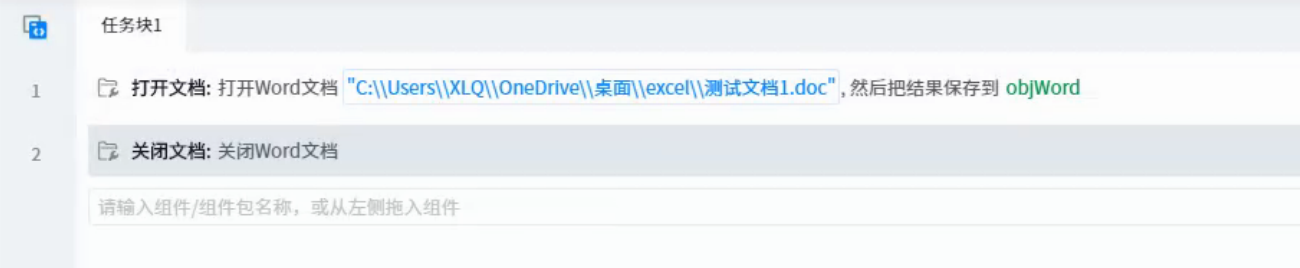 ● Document object: represents the word document object to be operated on. You can use variables returned by components such as open document.
