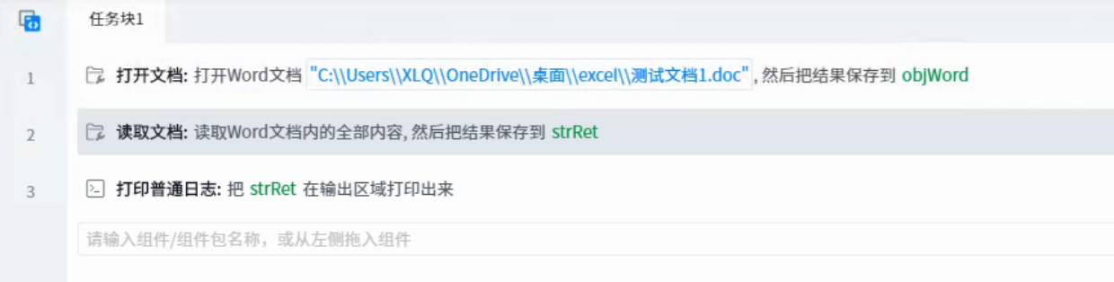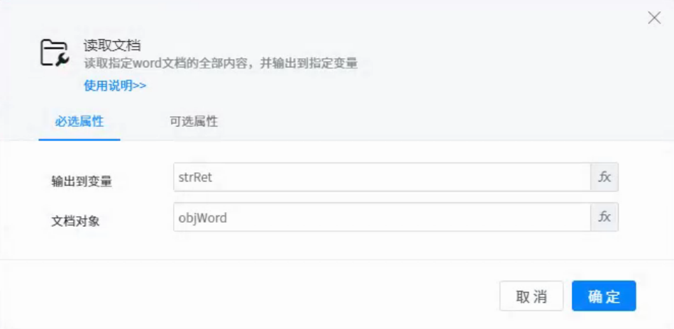 ● Document object: represents the word document object to be operated, which can be obtained by using components such as open document.