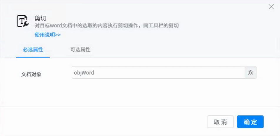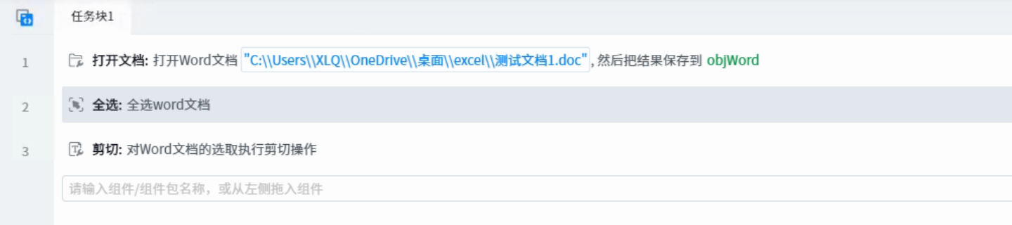 ● Document object: represents the word document object to be operated on. You can use the variables returned by components such as open document.