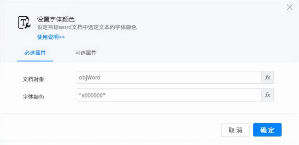 ● Document object: represents the word document object to be operated on. You can use the variables returned by components such as open document.