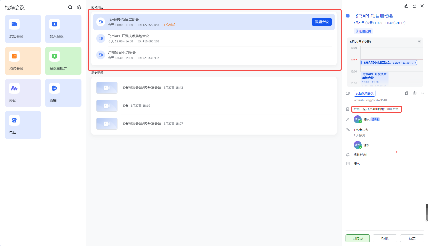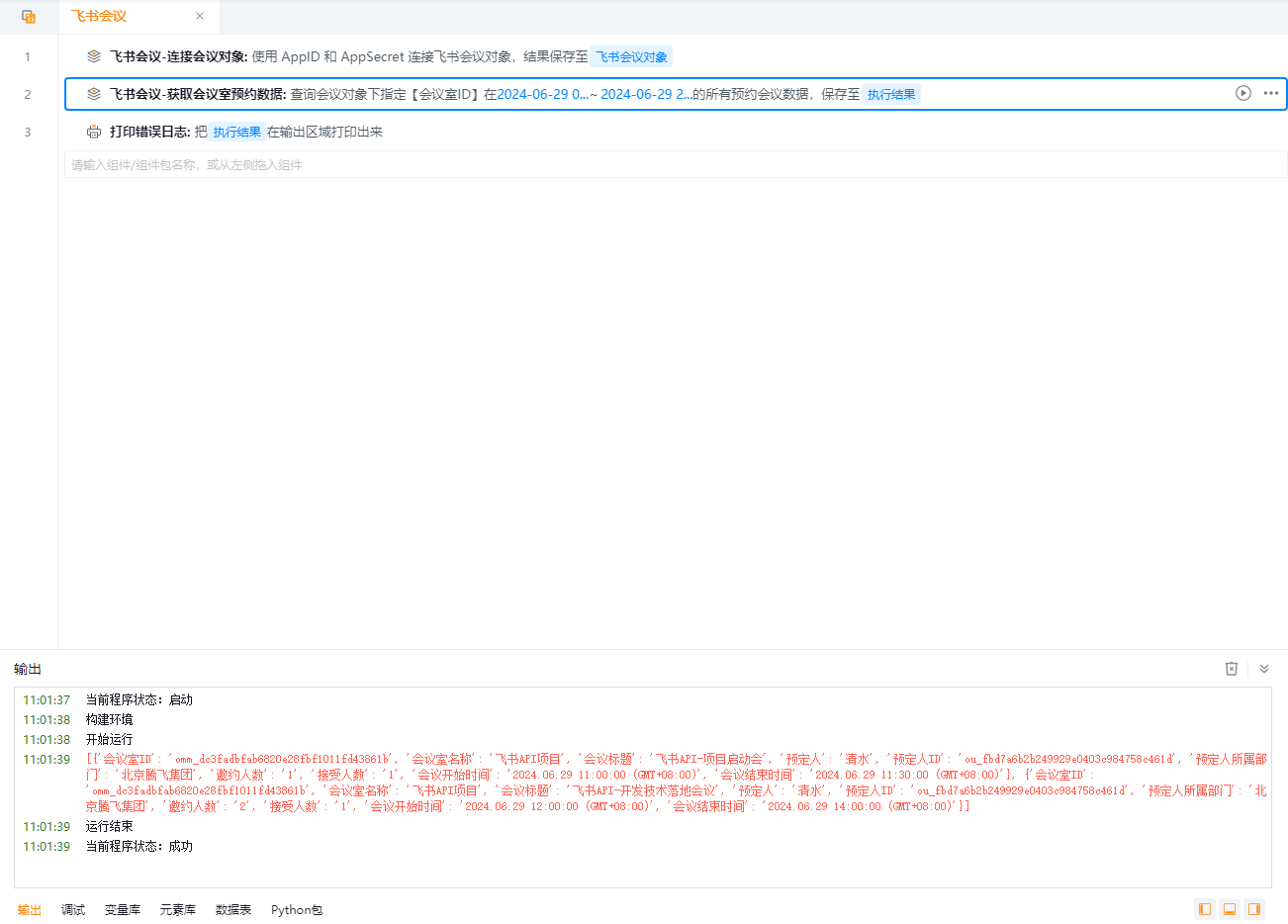 实例描述:飞书会议-获取会议室预约数据,获取指定会议室【飞书API项目】2024-06-29这天的所有预约会议信息,并将执行结果输出至控制台。