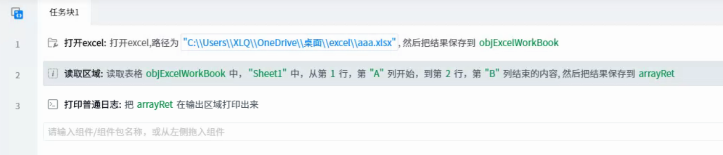 Read excel, rows 1 to 2, columns a to B. Then print it out through the log.