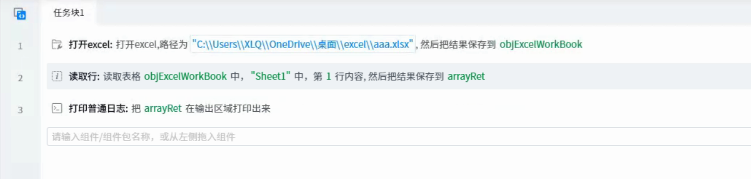 Read excel, line 1 data. Then print it out through the log.