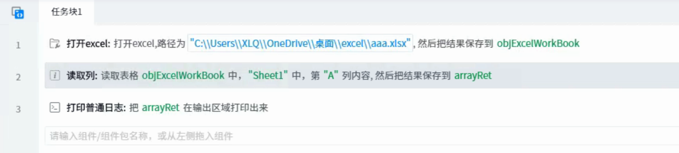 Read excel, column a data. Then print it out through the log.