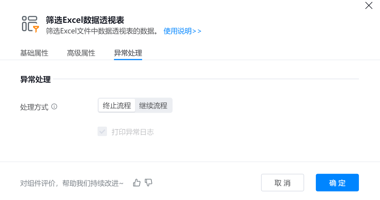 ● 透视表名称:必填,支持选择字符串类型变量,支持点击“从Excel中获取”icon拾取Excel中的透视表。可以使用新建透视表输出的变量。