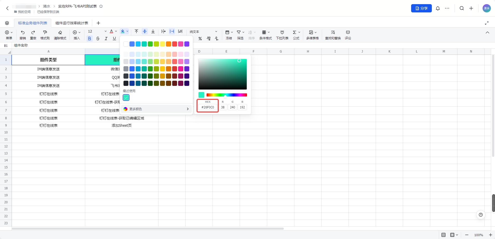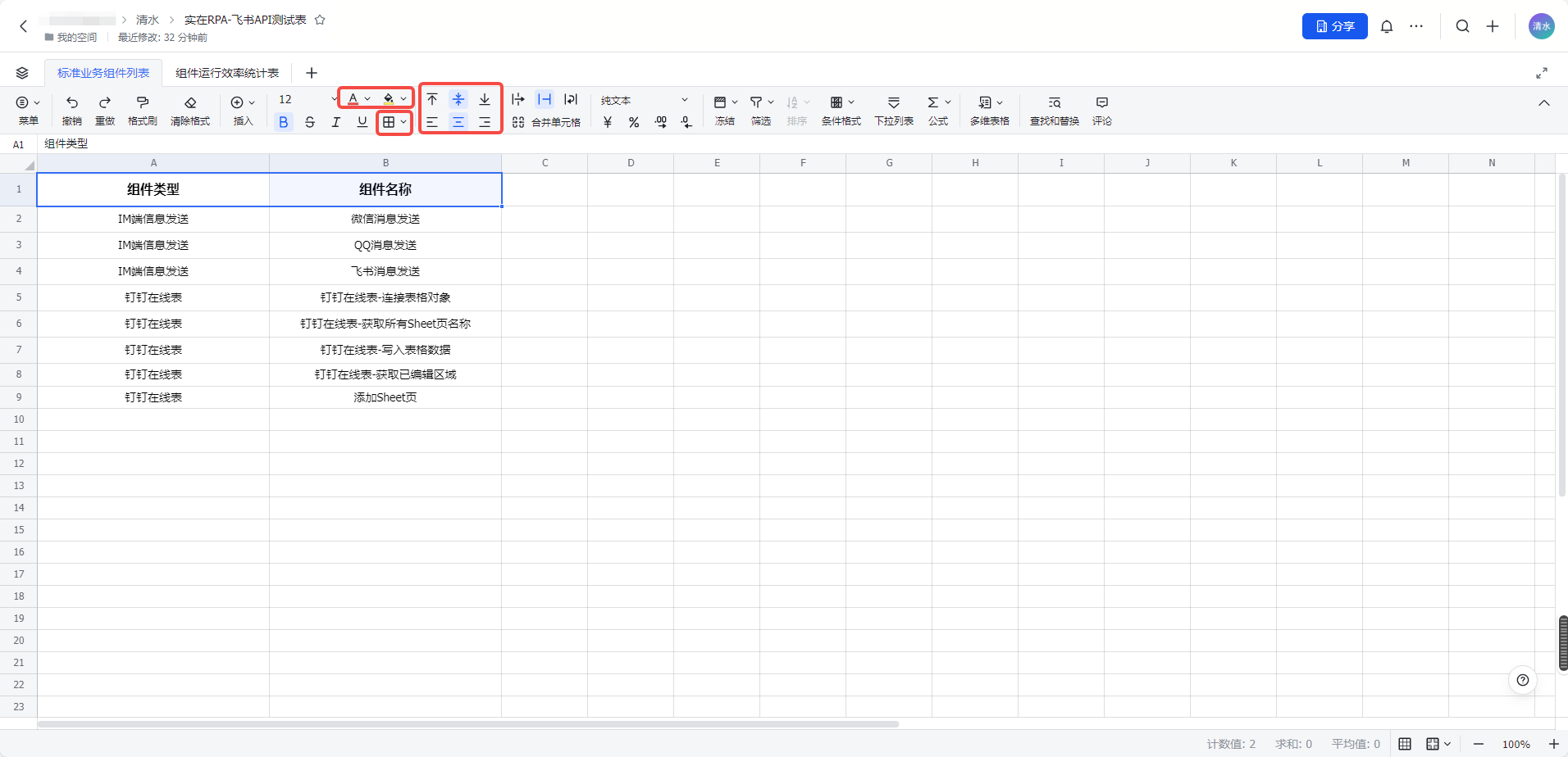 在飞书在线表格中Sheet页指定单元格的字体样式,可以设置单元格的对齐方式、背景颜色、字体颜色、边框等,本组件与下图操作实现效果一致