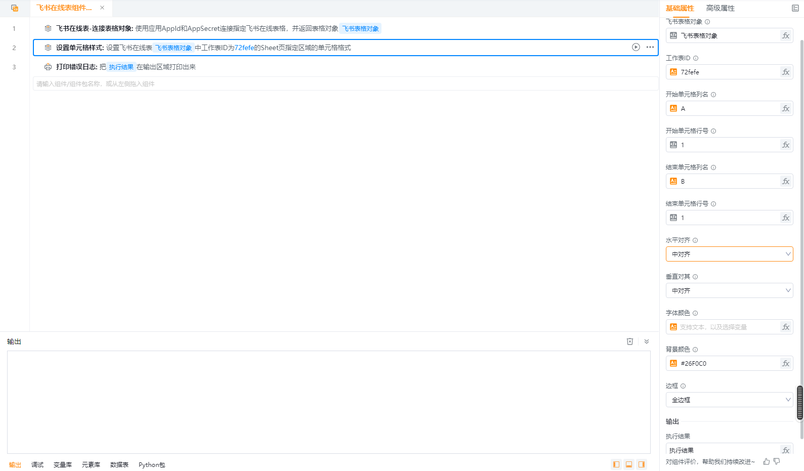 在飞书在线表的名为‘标准业务组件列表’的Sheet页中,设置"A1:B1"的单元格样式,水平和垂直都进行居中对齐、且全边框,背景颜色设置成"绿色",并将执行结果输出至控制台。