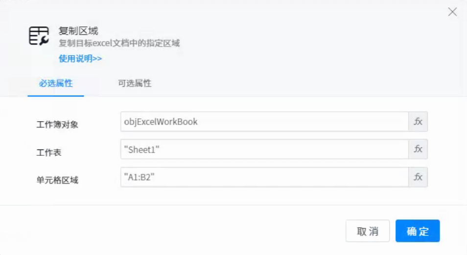 ●Cell range: the cell range to copy. For example, "A1: B2" means to copy the range between A1 and B2.