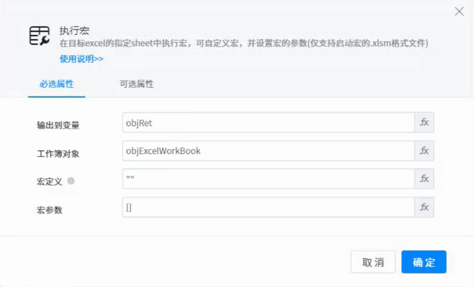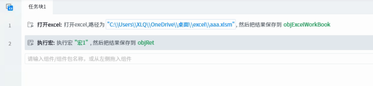 (2) RPA process: open excel and the component & ldquo; Macro definition & rdquo; Parameter, enter the macro name in Excel.