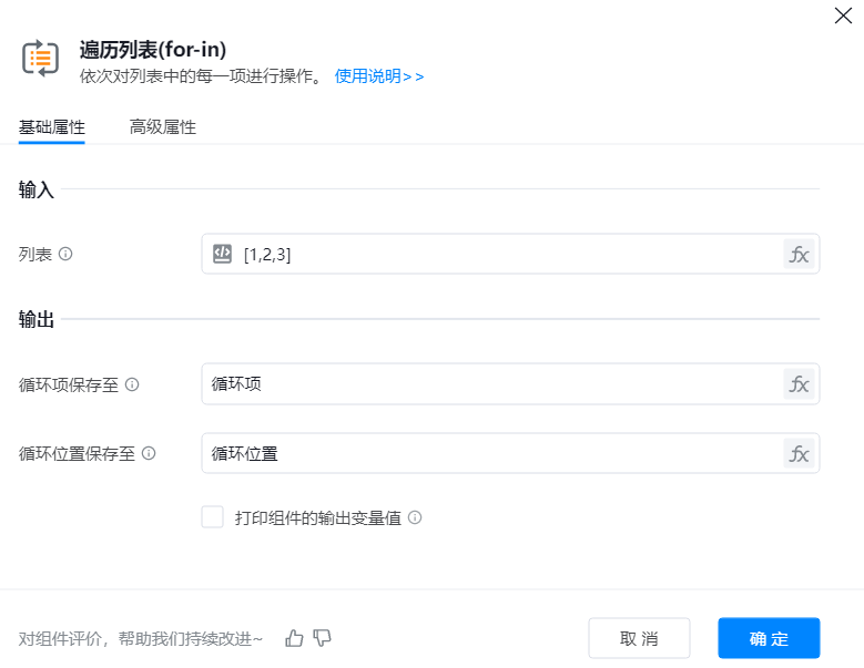 ● 列表:选择想要遍历的列表,支持手动输入列表,需要用[]包括整个列表,不同的值用 ”,“ 隔开;也支持从变量库中直接选择变量。
